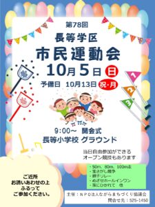 2025.10.04 開催日: 運動会ポスター78回2025 最新の記事 各事業部 自治連合会 社会福祉協議会 民生委員児童委員協議会 青少年育成協議会 体育文化連盟 活性化協議会 健康推進協議会 自主防災会 リンク集 長等小学校 長等小学校 長等っ子だより 長等幼稚園 皇子山中学校 大津市